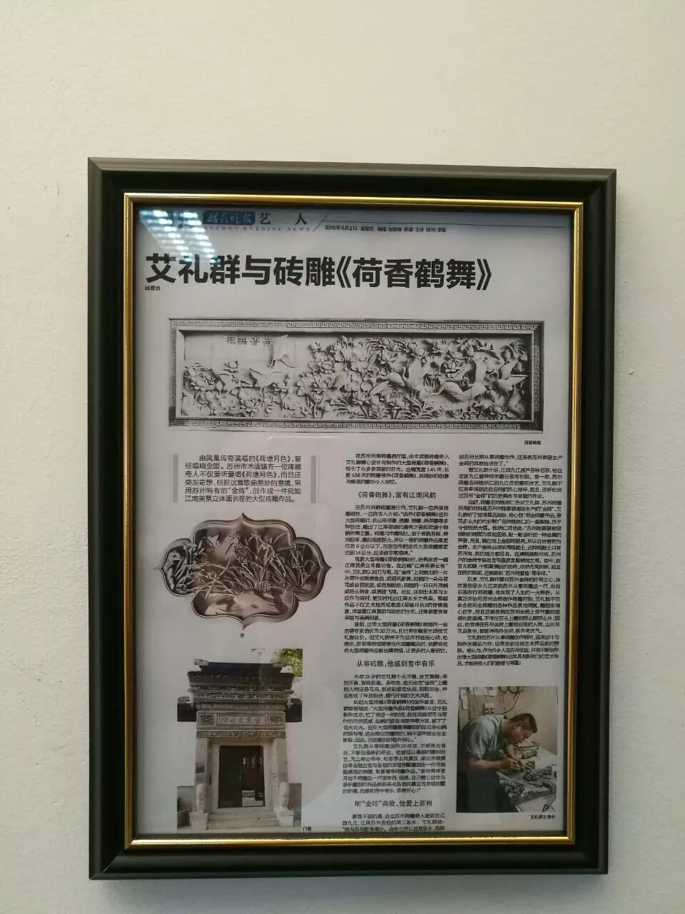 目前,這件大型磚雕《荷香鶴舞》被當(dāng)?shù)靥K派磚雕協(xié)會(huì)的專家估價(jià)為25萬元,而且,已有收藏家主動(dòng)找艾禮群進(jìn)行討價(jià)還價(jià)。但是,艾禮群并不為經(jīng)濟(jì)利益而心動(dòng),他表示,等今后磚雕博物館在木瀆鎮(zhèn)建成后,要將這件大型磚雕作品獻(xiàn)給該博物館。