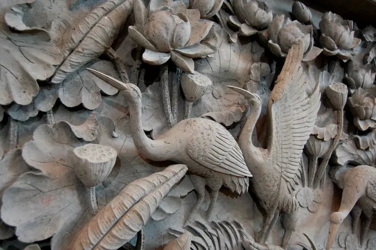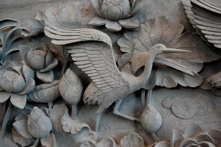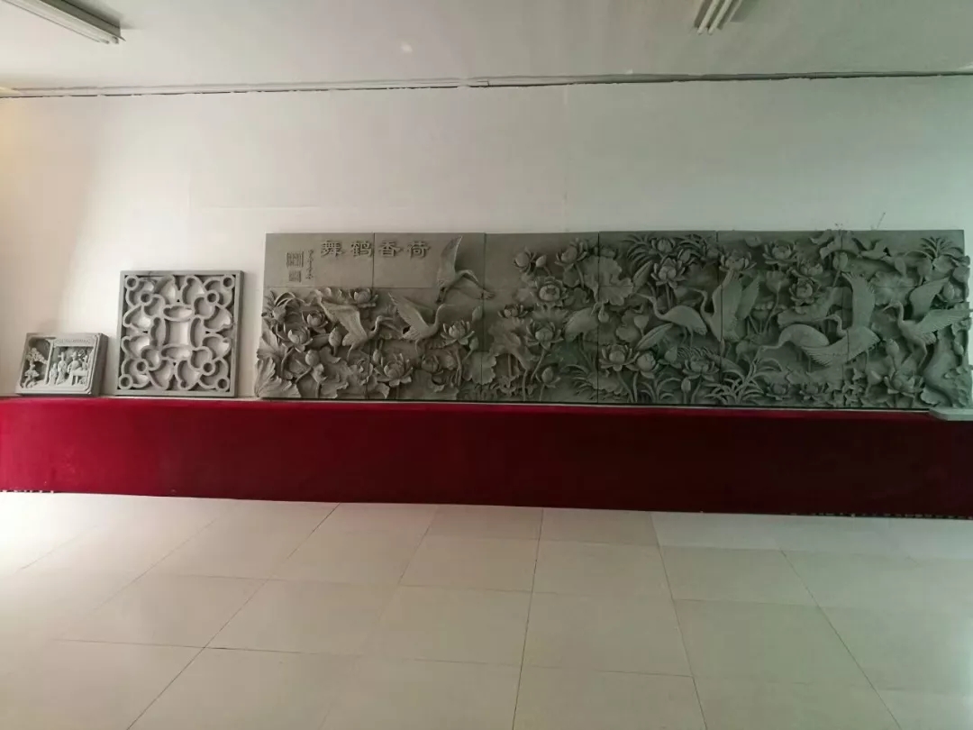 觀賞大型磚雕《荷香鶴舞》時(shí),仿佛欣賞一幅江南美景立體畫長(zhǎng)卷。在“江南美景長(zhǎng)卷”中,艾禮群以刻刀為筆,在“金磚”上刻畫出的一片片荷葉有微微卷曲、有迎風(fēng)舒展;刻畫的一朵朵荷花或含苞欲放,或競(jìng)相綻放;刻畫的一只只丹頂鶴有低頭捕食,有展翅飛翔。而且,還刻出水草與水紋作為陪襯,更加襯托出江南水鄉(xiāng)之秀美。整幅作品不僅藝術(shù)地再現(xiàn)歌曲《荷塘月色》的詩情畫意,洋溢著江南夏韻與盎然的生機(jī),而且,還寓意著吉祥幸福與美滿和諧。